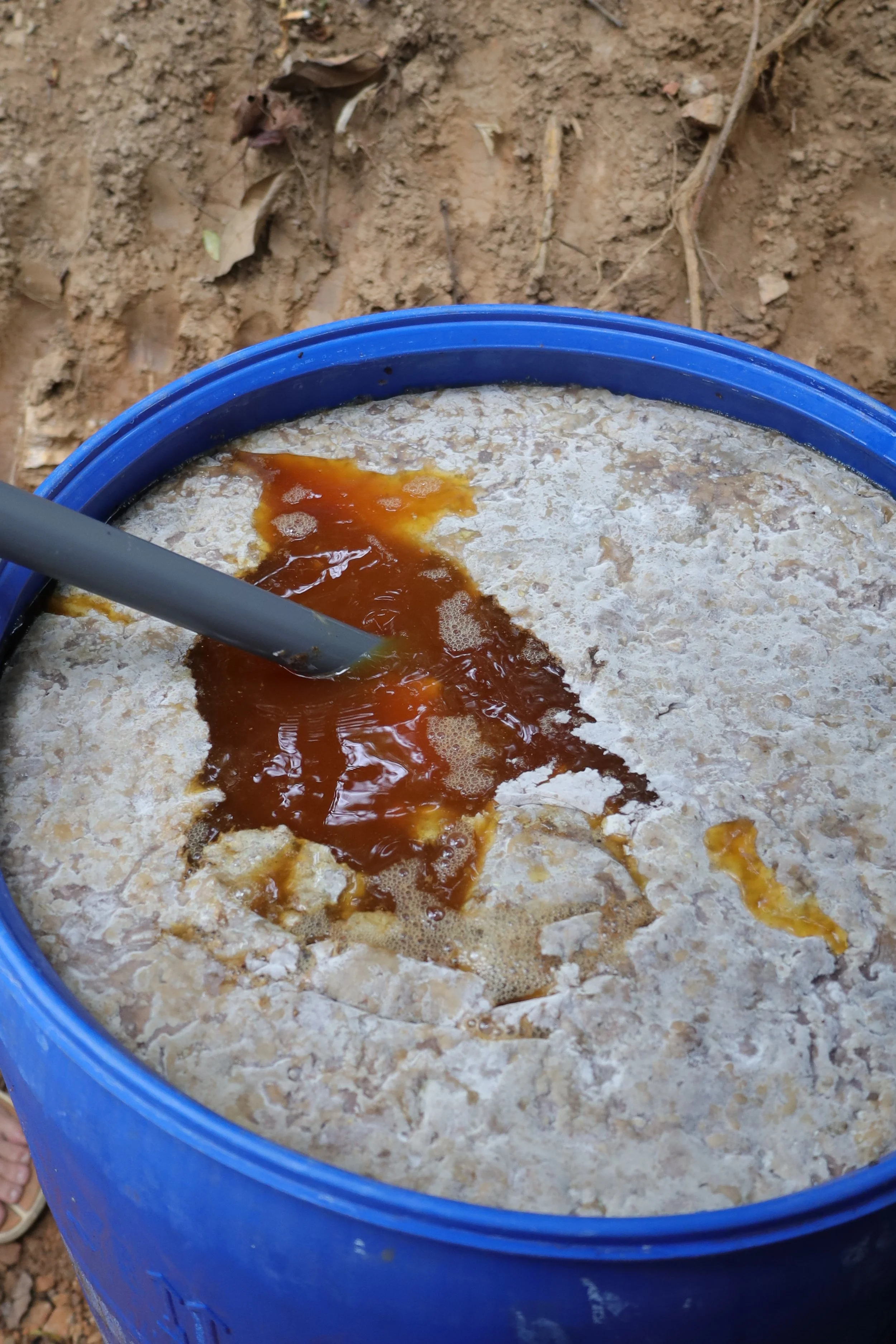 經過一個月的發酵,他用花生麩和糖蜜製成的營養液已經準備好使用,其中含有適量的氮和其他微量營養素,以支持植物的健康生長。