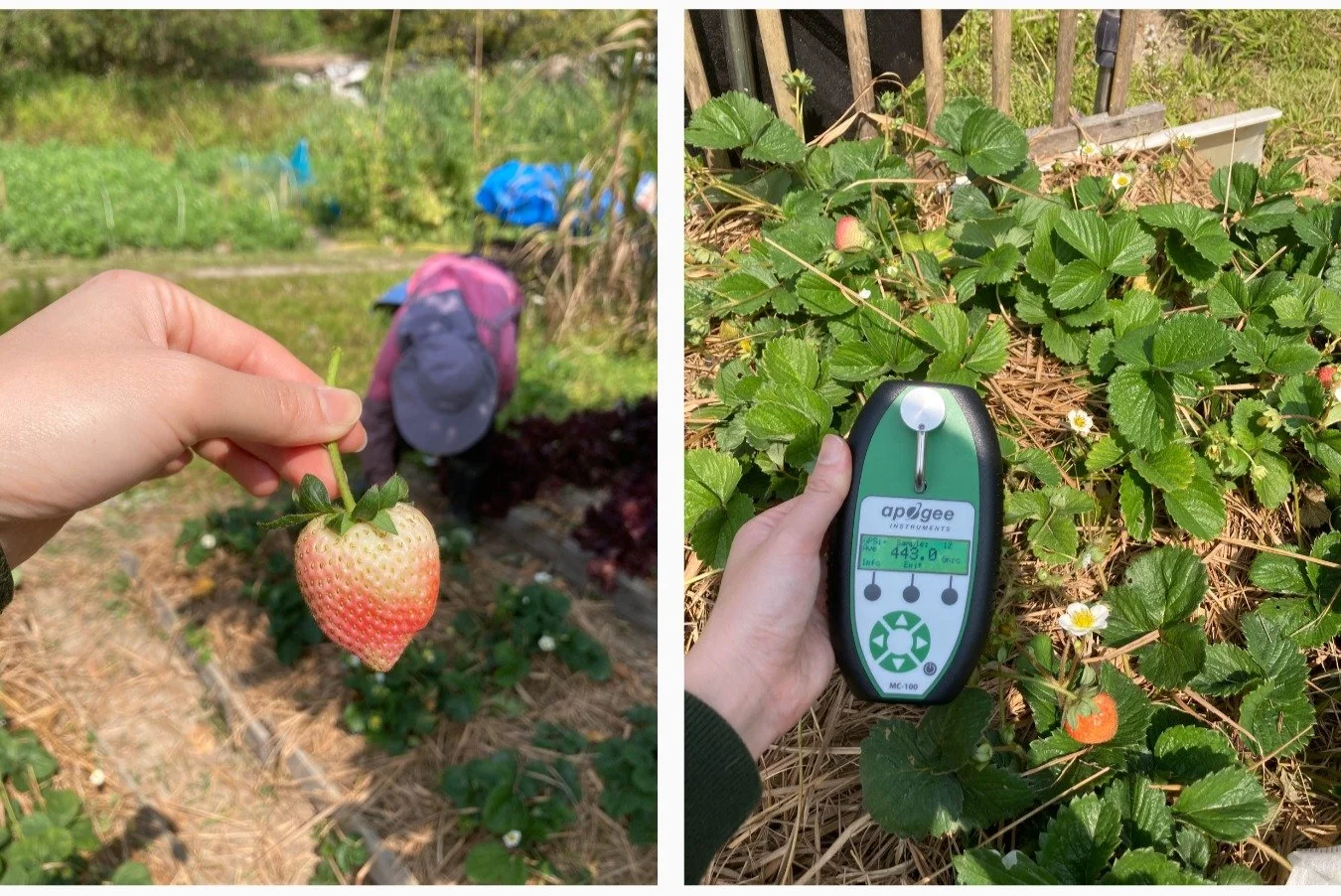 在温暖天氣下,依然美味得不可思議的草莓(這是來自日本的「淡雪」種)。它完全沒有病蟲害問題。我們一邊試味,一邊為葉片量葉綠素水平,雖然水平不算最好,但在這種不合適草莓的天氣下也算是不錯的了。